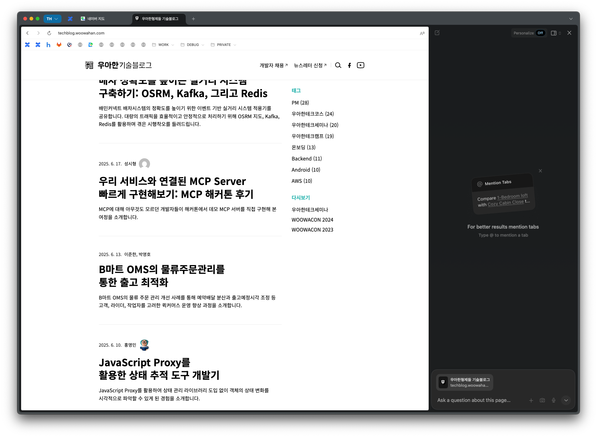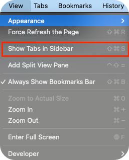 - Arc 브라우저에 적응이 되신 분은 탭이 상단에 노출되는 것이 불편할 수 있을 것 같습니다. 상단의 'View>Show Tabs in Sidebar'에서 아크와 유사하게 탭 목록을 왼쪽 사이드에서 볼 수 있습니다.