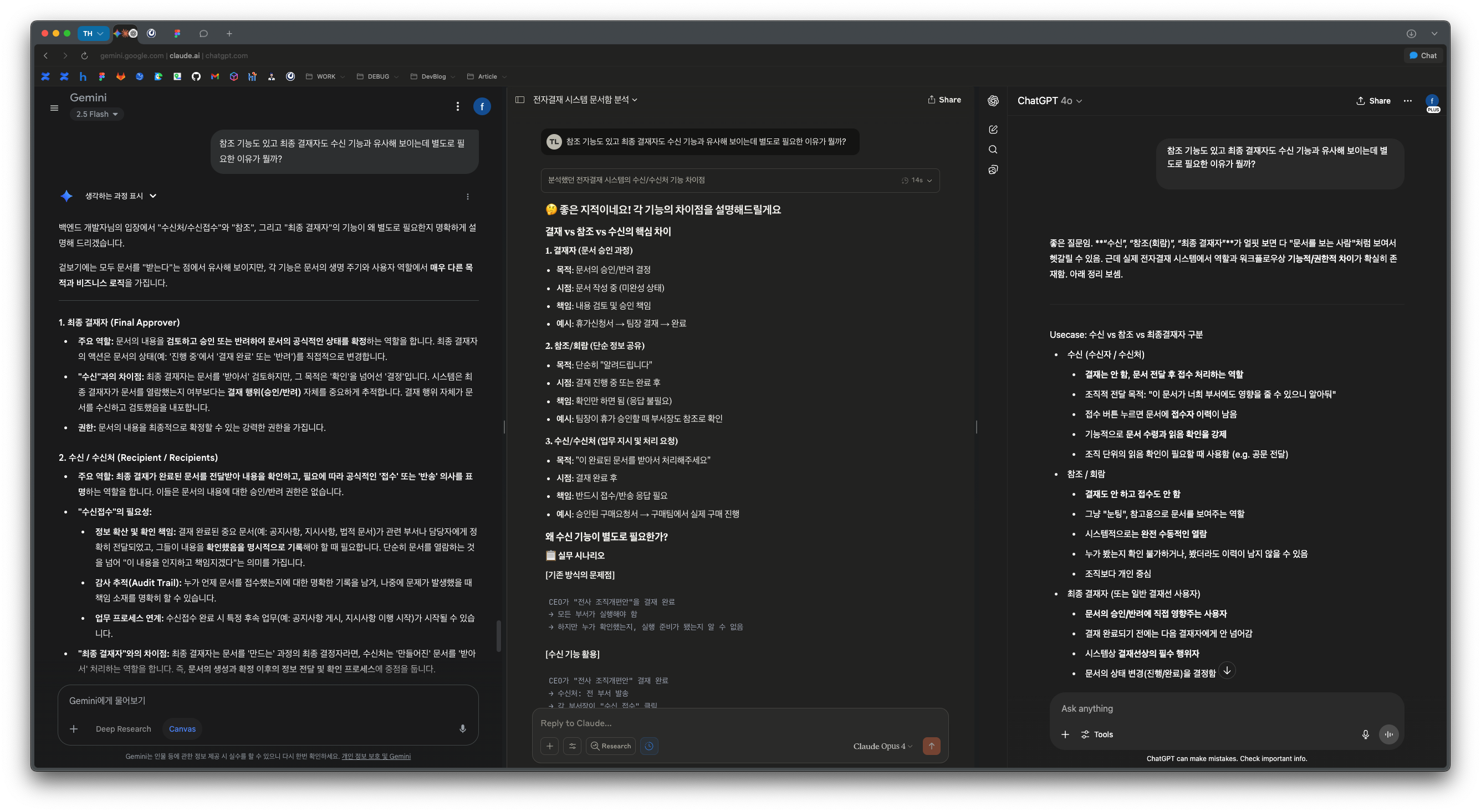- 아래와 같이 Gemini/Claude/ChatGPT 세 개의 화면을 Split 해둔 탭을 고정하여 동일한 질문을 한꺼번에 확인할 수 있습니다.
