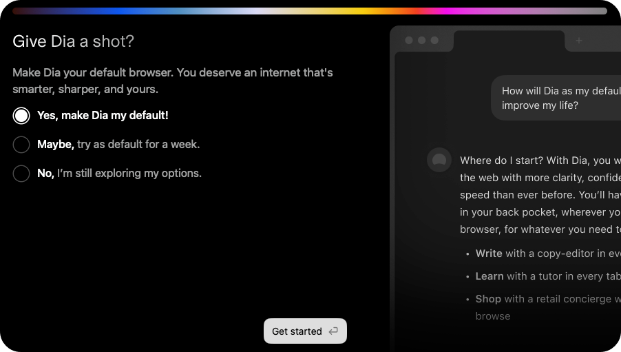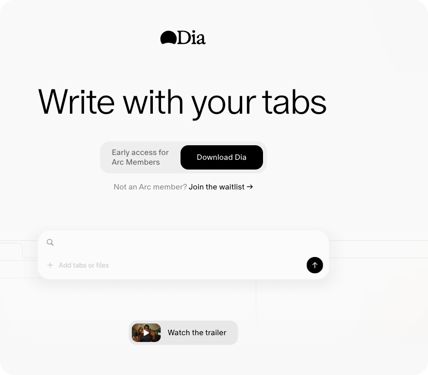 Dia is the AI browser from The Browser Company. Chat with your tabs, write in your own voice, learn and plan faster, shop, and more — all with privacy that you control.