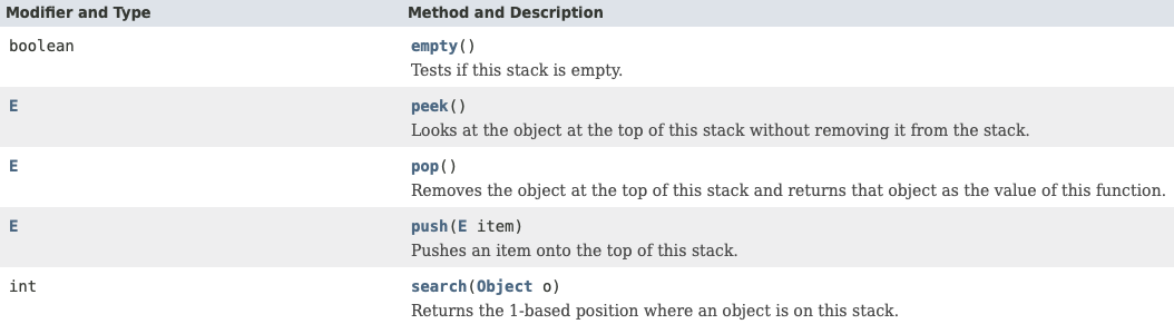 스택이 비어있는지 확인할 수 있는 메서드, 그리고 요소를 찾을 수 있는 메서드와 상단으로부터 얼마나 떨어져 있는지 찾기 위한 메서드가 제공됩니다. - 더 완전하고, 일관된 LIFO 스택 작업의 set은 Deque 인터페이스와 이것을 상속함으로써 제공됩니다.