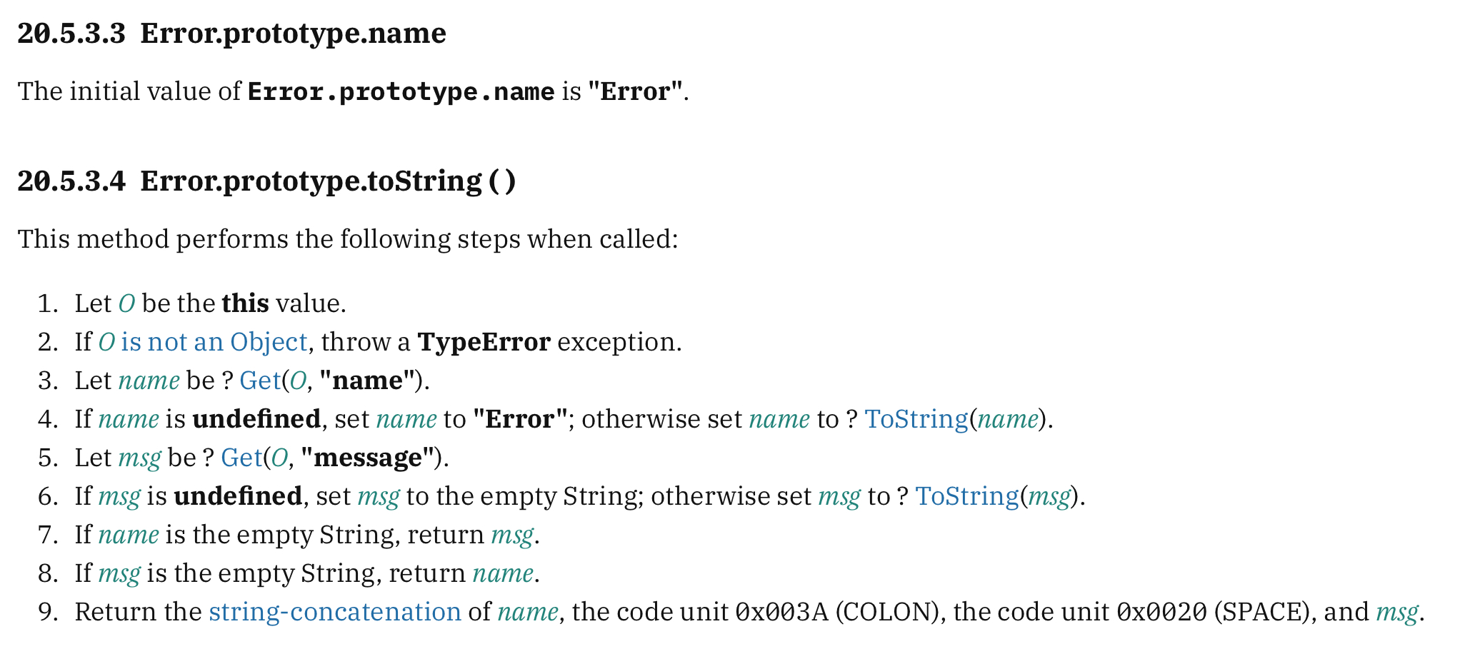 에러를 반환할 때 호출되는 toString 메소드는 name이 존재하지 않을 경우 "Error: "와 message를 붙여서 반환하게 된다.