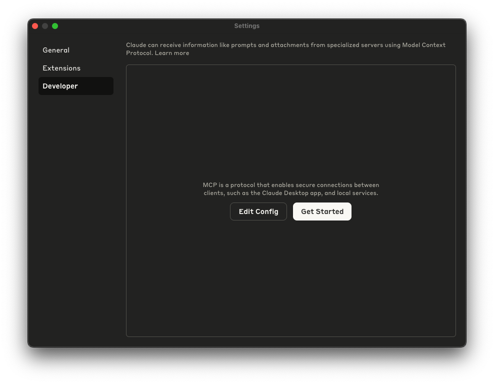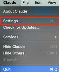 - 클로드 앱을 실행한 상태에서 상태표시줄의 'Claude > Settings...' 혹은 command + ','를 누르면 설정 창이 뜨게 됩니다.