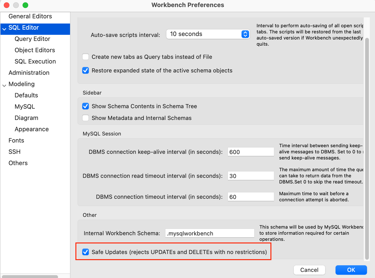 MySQL Workbench의 기본옵션으로 using safe update mode가 켜져 있음.